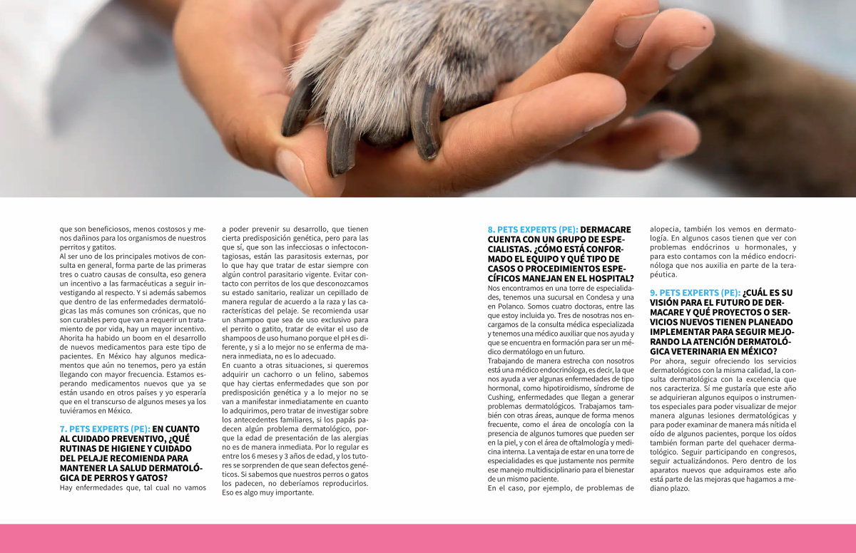 9. PETS EXPERTS( PE): ¿ CUÁL ES SU VISIÓN PARA EL FUTURO DE DER- MACARE Y QUÉ PROYECTOS O SER- VICIOS NUEVOS TIENEN PLANEADO IMPLEMENTAR PARA SEGUIR MEJO- RANDO LA ATENCIÓN DERMATOLÓ- GICA VETERINARIA EN MÉXICO?