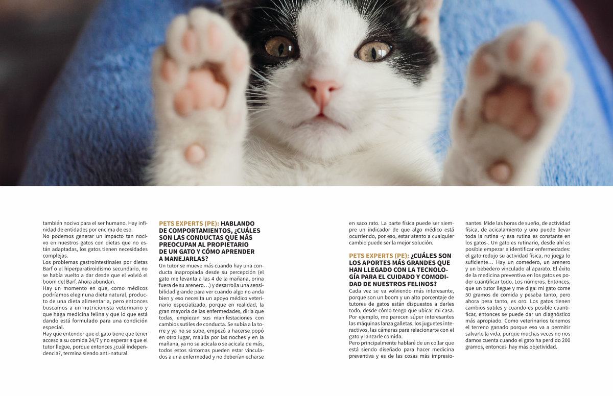 también nocivo para el ser humano. Hay infinidad de entidades por encima de eso. No podemos generar un impacto tan nocivo en nuestros gatos con dietas que no están adaptadas, los gatos tienen necesidades complejas. Los problemas gastrointestinales por dietas Barf o el hiperparatiroidismo secundario, no se había vuelto a dar desde que el volvió el boom del Barf. Ahora abundan. Hay un momento en que, como médicos podríamos elegir una dieta natural, producto de una dieta alimentaria, pero entonces buscamos a un nutricionista veterinario y que haga medicina felina y que lo que está dando está formulado para una condición especial. Hay que entender que el gato tiene que tener acceso a su comida 24 / 7 y no esperar a que el tutor llegue, porque entonces ¿ cuál independencia?, termina siendo anti-natural.