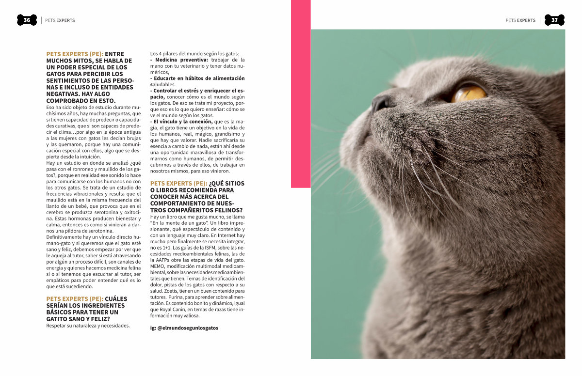 Los 4 pilares del mundo según los gatos:- Medicina preventiva: trabajar de la mano con tu veterinario y tener datos numéricos,- Educarte en hábitos de alimentación saludables.- Controlar el estrés y enriquecer el espacio, conocer cómo es el mundo según los gatos. De eso se trata mi proyecto, porque eso es lo que quiero enseñar: cómo se ve el mundo según los gatos.- El vínculo y la conexión, que es la magia, el gato tiene un objetivo en la vida de los humanos, real, mágico, grandísimo y que hay que valorar. Nadie sacrificaría su esencia a cambio de nada, están ahí desde una oportunidad maravillosa de transformarnos como humanos, de permitir descubrirnos a través de ellos, de trabajar en nosotros mismos, para eso vinieron.