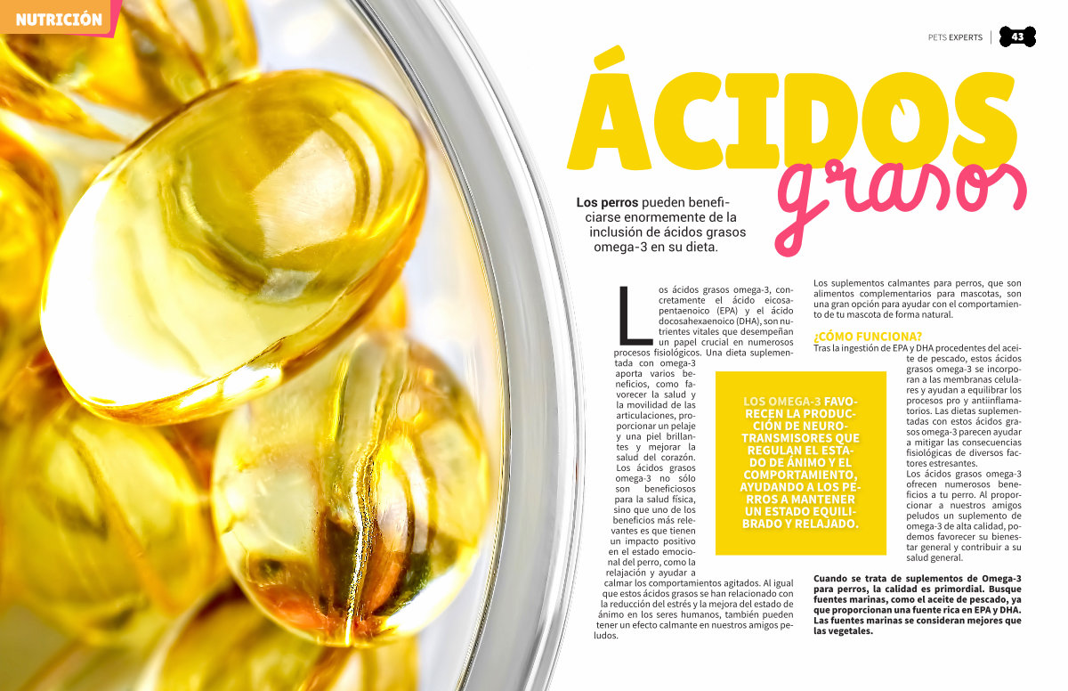 LOS OMEGA-3 FAVO- RECEN LA PRODUC- CIÓN DE NEURO- TRANSMISORES QUE REGULAN EL ESTA- DO DE ÁNIMO Y EL COMPORTAMIENTO, AYUDANDO A LOS PE- RROS A MANTENER UN ESTADO EQUILI- BRADO Y RELAJADO.
