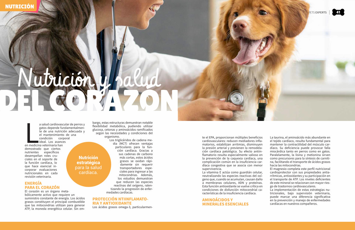 PETS EXPERTS 41 te el EPA, proporcionan múltiples beneficios cardiovasculares: reducen mediadores inflamatorios, estabilizan arritmias, disminuyen la presión arterial y previenen la remodelación cardíaca patológica. Su efecto antiinflamatorio resulta especialmente valioso en la prevención de la caquexia cardíaca, una complicación común en la insuficiencia cardíaca congestiva que se asocia con menor supervivencia. La vitamina E actúa como guardián celular, neutralizando las especies reactivas del oxígeno que, cuando se acumulan, causan daño a membranas celulares, ADN y proteínas. Esta función antioxidante se vuelve crítica en condiciones de disfunción mitocondrial características de la insuficiencia cardíaca.