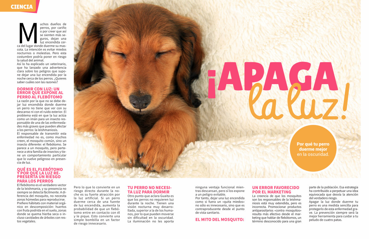 La creencia de que los mosquitos son los responsables de la leishmaniosis está muy extendida, pero es incorrecta. Promocionar productos antiparasitarios « contra mosquitos » resulta más efectivo desde el marketing que hablar de flebótomos, un término desconocido para una gran parte de la población. Esa estrategia ha contribuido a perpetuar una idea equivocada que desvía la atención del verdadero riesgo. Apagar la luz donde duerme tu perro es una medida sencilla para protegerlo de esta enfermedad grave. La prevención siempre será la mejor herramienta para cuidar a tu peludo de cuatro patas.