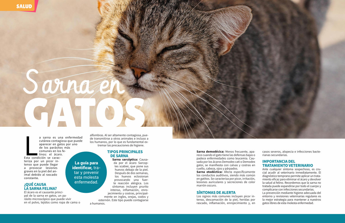 Sarna demodécica: Menos frecuente, aparece cuando el gato tiene las defensas bajas o padece enfermedades como leucemia. Causada por los ácaros Demodex cati o Demodex gatoi, se manifiesta con calvas y costras en cuello, cabeza, ojos y párpados. Sarna otodéctica: Afecta específicamente los conductos auditivos, siendo más común en gatitos. Se caracteriza por picor, irritación, lesiones auriculares y secreciones de color marrón oscuro.