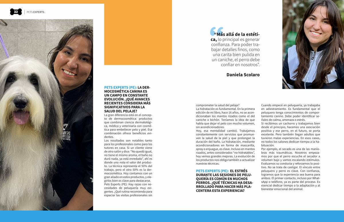 La gran diferencia está en el concepto de dermocosmética: productos que combinan ciencia dermatológica, médica y veterinaria con cosmética para embellecer pelo y piel. Esa combinación ofrece beneficios evidentes. Los resultados son notables tanto para los profesionales como para los tutores en casa. Si un cliente viene de otro salón y dice:“ No quedó igual, no tiene el mismo aroma, el baño no duró nada, ya está enredado”, ahí es donde uno nota el valor del producto. La técnica representa el 50 % del trabajo, pero el otro 50 % es la dermocosmética. Hoy contamos con un gran aliado en estos productos, y elegirlos bien es clave para destacarse. Pets Experts( PE): Hay razas con necesidades de peluquería muy exigentes. ¿ Qué rutina recomienda para espaciar las visitas profesionales sin
