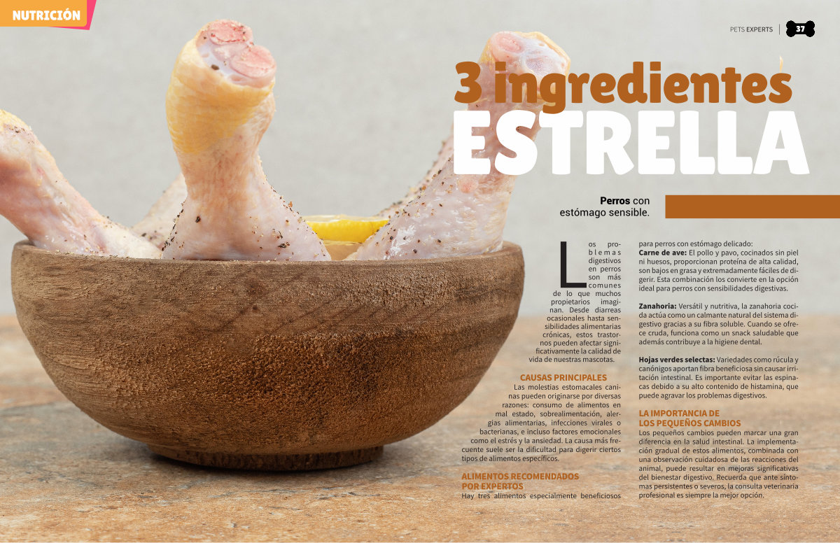 Hay tres alimentos especialmente beneficiosos para perros con estómago delicado: Carne de ave: El pollo y pavo, cocinados sin piel ni huesos, proporcionan proteína de alta calidad, son bajos en grasa y extremadamente fáciles de digerir. Esta combinación los convierte en la opción ideal para perros con sensibilidades digestivas.