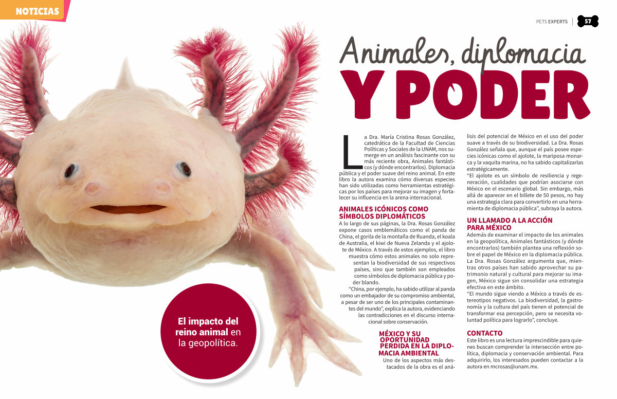 La Dra. María Cristina Rosas González, catedrática de la Facultad de Ciencias Políticas y Sociales de la UNAM, nos sumerge en un análisis fascinante con su más reciente obra, Animales fantásticos( y dónde encontrarlos). Diplomacia pública y el poder suave del reino animal. En este libro la autora examina cómo diversas especies han sido utilizadas como herramientas estratégicas por los países para mejorar su imagen y fortalecer su influencia en la arena internacional.