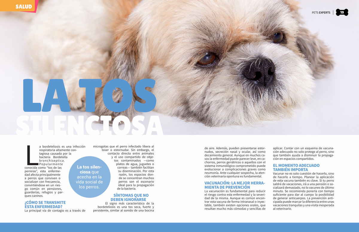 microgotas que el perro infectado libera al toser o estornudar. Sin embargo, el contacto directo entre animales y el uso compartido de objetos contaminados— como platos de agua, juguetes o correas— también facilitan su diseminación. Por esta razón, los espacios donde se concentran muchos perros son el escenario ideal para la propagación de la bacteria.