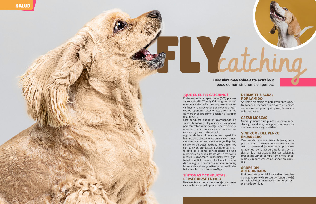 El síndrome de atrapamoscas( FCS) por sus siglas en inglés“ The fly Catching síndrome” es una rara afectación que se presenta en los caninos y se caracteriza por evidenciar episodios repentinos, ocasionales o constantes de morder el aire como si fueran a“ atrapar una mosca”. Esta conducta puede ir acompañada de saltos, lamidos y degluciones. Los perros parecen estar mirando algo y de repente lo muerden. La causa de este síndrome es desconocido y muy controvertido. Algunas de las explicaciones de su aparición han incluido afectaciones en el sistema nervioso central como convulsiones, epilepsias, síndrome de dolor neuropático, trastornos compulsivos, conductas alucinatorias y estereotipias o como consecuencia de una molestia o dolor resultante de un trastorno medico subyacente( especialmente gastrointestinal). Incluso se plantea la hipótesis de que algunos perros que atrapan moscas, levantan la cabeza y extienden el cuello debido a molestias o dolor esofágico.