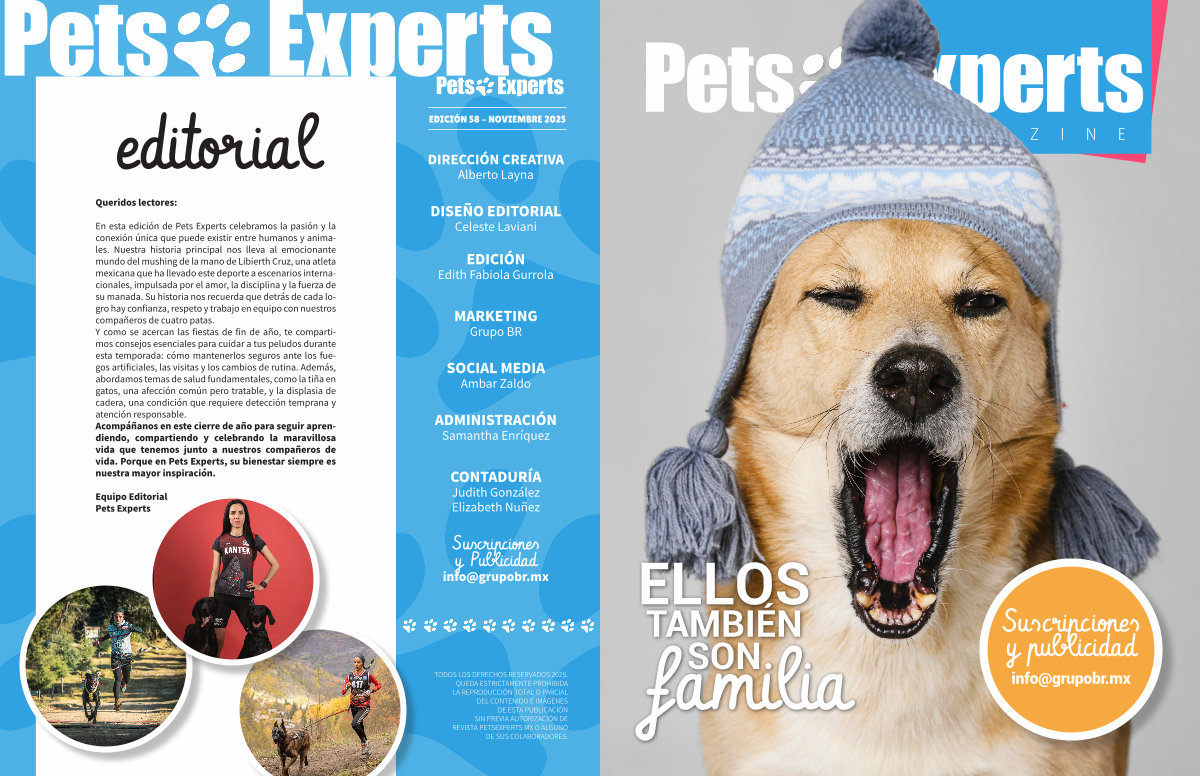 En esta edición de Pets Experts celebramos la pasión y la conexión única que puede existir entre humanos y animales. Nuestra historia principal nos lleva al emocionante mundo del mushing de la mano de Libierth Cruz, una atleta mexicana que ha llevado este deporte a escenarios internacionales, impulsada por el amor, la disciplina y la fuerza de su manada. Su historia nos recuerda que detrás de cada logro hay confianza, respeto y trabajo en equipo con nuestros compañeros de cuatro patas. Y como se acercan las fiestas de fin de año, te compartimos consejos esenciales para cuidar a tus peludos durante esta temporada: cómo mantenerlos seguros ante los fuegos artificiales, las visitas y los cambios de rutina. Además, abordamos temas de salud fundamentales, como la tiña en gatos, una afección común pero tratable, y la displasia de cadera, una condición que requiere detección temprana y atención responsable. Acompáñanos en este cierre de año para seguir aprendiendo, compartiendo y celebrando la maravillosa vida que tenemos junto a nuestros compañeros de vida. Porque en Pets Experts, su bienestar siempre es nuestra mayor inspiración.