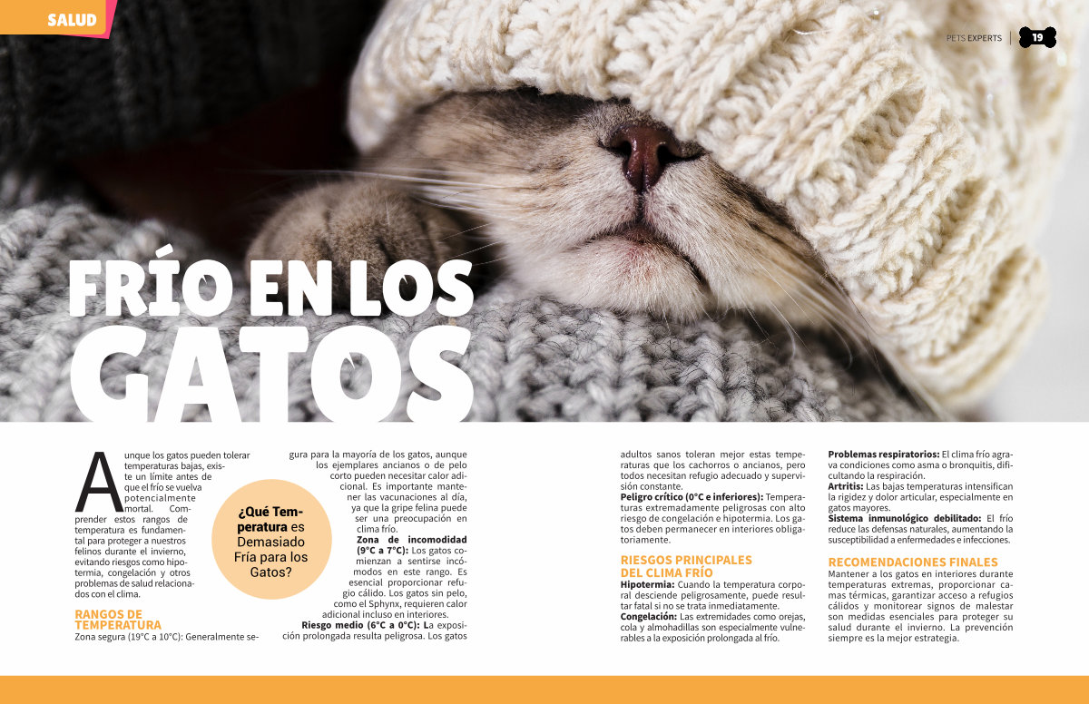 Problemas respiratorios: El clima frío agrava condiciones como asma o bronquitis, dificultando la respiración. Artritis: Las bajas temperaturas intensifican la rigidez y dolor articular, especialmente en gatos mayores. Sistema inmunológico debilitado: El frío reduce las defensas naturales, aumentando la susceptibilidad a enfermedades e infecciones.