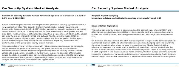 The global car security system is segmented on the basis of sales channel( OEM and Aftermarket), product type( immobilizer system, remote central locking system, alarm system and other systems) and car type( Economic cars, Mid-range cars and Premium cars).