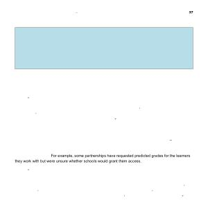 “ Data-sharing and obtaining pre-16 data ( that demands parental permission ) is challenging and , so far , only 6 % of students have been tracked compared to usually 50 % in previous years . The relationship with the school is vital for anything in terms of the quantifiable data , so anything to do with assessments , which is going to be dependent on the relationship with the schools . That ’ s why it ’ s so important to build those up before you start doing it . If you don ’ t have that relationship , you might hit a brick wall in trying to access the data that ’ s required to demonstrate impact .” ( Partnership lead )