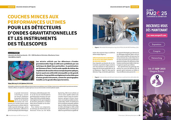Les miroirs utilisés par les détecteurs d’ ondes gravitationnelles Virgo et LIGO sont synthétisés par une technique de dépôt bien particulière: la pulvérisation par faisceaux d’ ions. C’ est la seule capable de réaliser des empilements de couches minces exempts de pertes optiques, tout en ayant une uniformité remarquable sur des grands diamètres. Ces propriétés sont également recherchées pour d’ autres grands instruments, comme les spectrographes installés sur les grands télescopes terrestres.