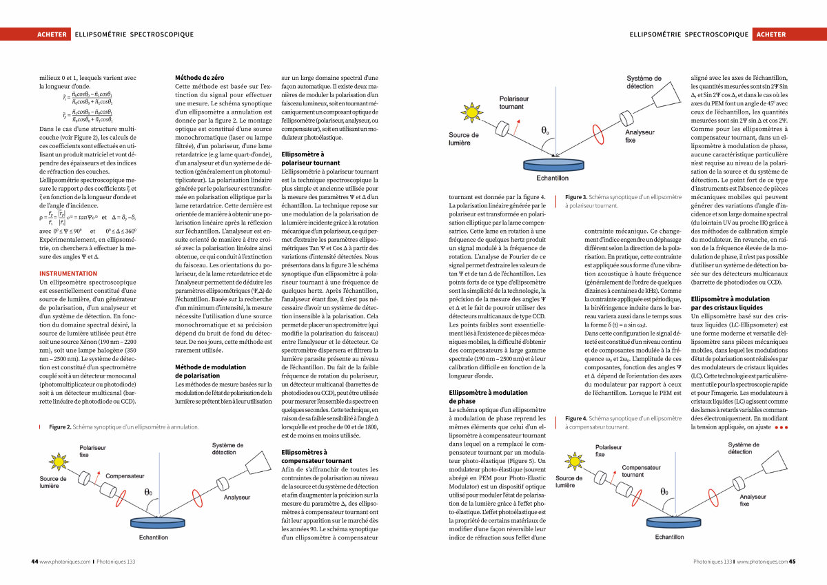 Ellipsométrie SPECTROSCOPIQUE ACHETER tournant est donnée par la figure 4. La polarisation linéaire générée par le polariseur est transformée en polarisation elliptique par la lame compensatrice. Cette lame en rotation à une fréquence de quelques hertz produit un signal modulé à la fréquence de rotation. L’ analyse de Fourier de ce signal permet d’ extraire les valeurs de tan Ψ et de tan Δ de l’ échantillon. Les points forts de ce type d’ ellipsomètre sont la simplicité de la technologie, la précision de la mesure des angles Ψ et Δ et le fait de pouvoir utiliser des détecteurs multicanaux de type CCD. Les points faibles sont essentiellement liés à l’ existence de pièces mécaniques mobiles, la difficulté d’ obtenir des compensateurs à large gamme spectrale( 190 nm – 2500 nm) et à leur calibration difficile en fonction de la longueur d’ onde.
