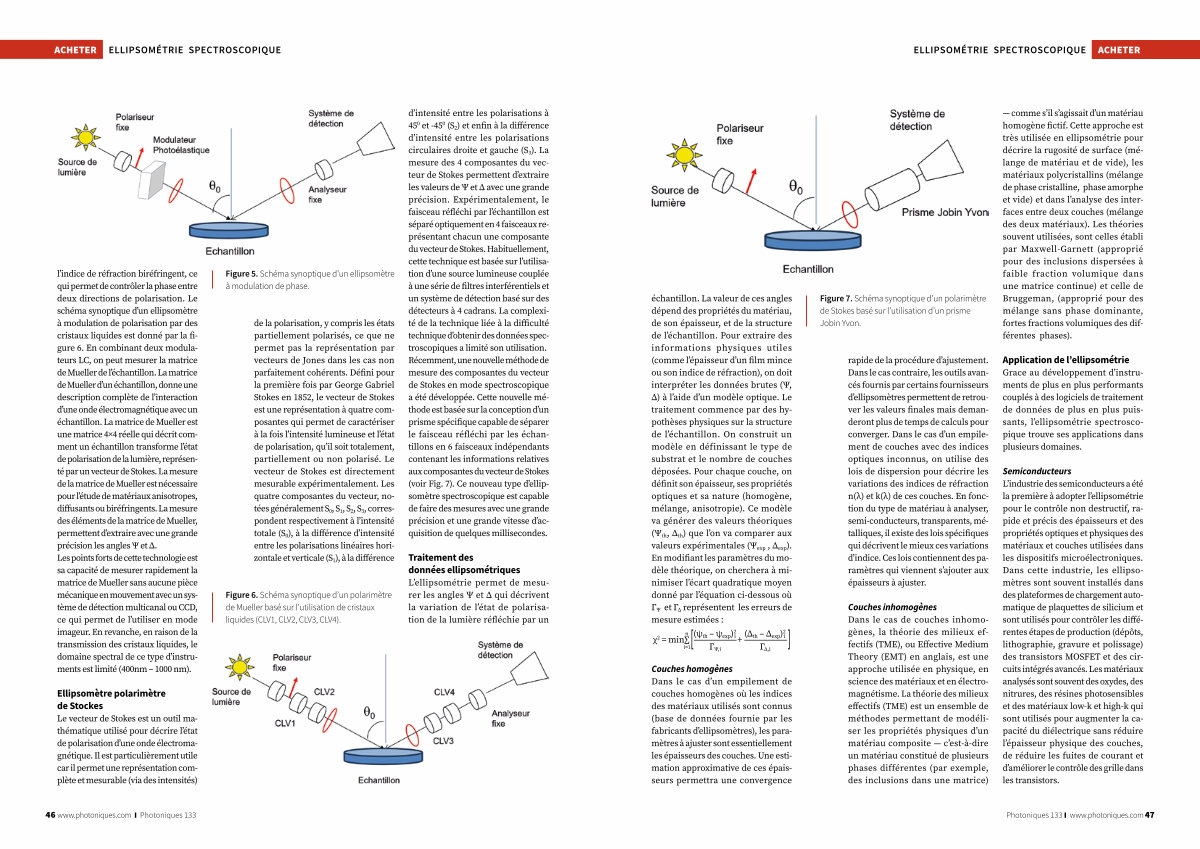 l’ indice de réfraction biréfringent, ce qui permet de contrôler la phase entre deux directions de polarisation. Le schéma synoptique d’ un ellipsomètre à modulation de polarisation par des cristaux liquides est donné par la figure 6. En combinant deux modulateurs LC, on peut mesurer la matrice de Mueller de l’ échantillon. La matrice de Mueller d’ un échantillon, donne une description complète de l’ interaction d’ une onde électromagnétique avec un échantillon. La matrice de Mueller est une matrice 4 × 4 réelle qui décrit comment un échantillon transforme l’ état de polarisation de la lumière, représenté par un vecteur de Stokes. La mesure de la matrice de Mueller est nécessaire pour l’ étude de matériaux anisotropes, diffusants ou biréfringents. La mesure des éléments de la matrice de Mueller, permettent d’ extraire avec une grande précision les angles Ψ et Δ. Les points forts de cette technologie est sa capacité de mesurer rapidement la matrice de Mueller sans aucune pièce mécanique en mouvement avec un système de détection multicanal ou CCD, ce qui permet de l’ utiliser en mode imageur. En revanche, en raison de la transmission des cristaux liquides, le domaine spectral de ce type d’ instruments est limité( 400nm – 1000 nm).