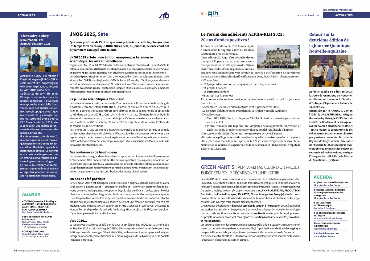 Alexandre Aubry, chercheur à l’ Institut Langevin( ESPCI – CNRS), est le lauréat 2025 du prestigieux Prix Jean Jerphagnon, décerné lors des JNOG 2025 à Sète. Spécialiste du contrôle et de l’ imagerie des ondes dans les milieux complexes, il développe une approche matricielle innovante, avec des applications en microscopie optique, acoustique, micro-ondes et sismologie. Son projet, couronné d’ une bourse ERC Consolidator en 2019, vise à concevoir une méthode universelle d’ imagerie à travers des milieux diffusants. Il a récemment cofondé OWLO, une startup issue de ses travaux, qui propose un microscope matriciel alliant flexibilité logicielle et performance optique. Ce système ouvre de nouvelles perspectives en embryologie, organoïdes, ophtalmologie ou dermatologie. Le Prix Jean Jerphagnon récompense chaque année un chercheur ou ingénieur pour son innovation à fort potentiel technologique.