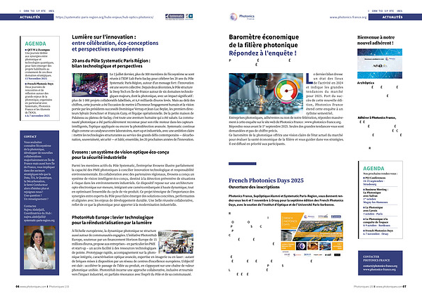 Le dernier bilan dresse un état des lieux de l’ activité en 2024 et indique les grandes tendances du marché pour 2025. Fort du succès de cette nouvelle édition, Photonics France étend cette enquête à un rythme semestriel. Entreprises photoniques, adhérentes ou non de notre fédération, répondez massivement à cette enquête sur le site web de Photonics France: www. photonics-france. org. Répondez-nous avant le 1 er septembre 2025. Seules des grandes tendances vous sont demandées et pas de chiffre précis. Ce baromètre de la photonique offrira une vision claire de l ' état actuel du marché pour évaluer la santé économique de la filière et vous guider dans vos stratégies. Il est diffusé en priorité aux participants.