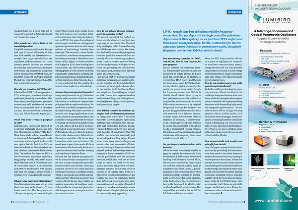 You have strong expertise in LiNbO 3 and BaTiO 3, how do they compare for your projects? LiNbO 3 remains the best suited material for frequency conversion. It is not deposited as single crystal by pulse laser deposition( PLD) or epitaxy, so we purchase TFLN wafers and then do top-down processing. BaTiO 3 is attractive for electro-optics and can be deposited or grown more easily, though for frequency conversion LiNbO 3 is clearly ahead. Rather than trying to beat performance records in this very competitive environment, we often differentiate our research by original design and features. For instance, we pushed Bragg modulators rather than only standard Mach-Zehnder layouts. Another recent development of those materials in my team, is their synthesis as solution processed films that can be easily nanoimprinted without the needs of complicated etching process. We just demonstrated metasurfaces and metalenses with frequency conversion and electro-optic effects.