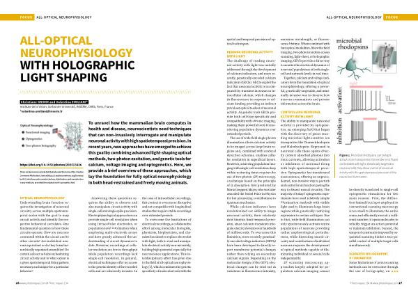 To overcome the limitations of electrical recordings, a collaborative effort among molecular biologists, physicists, biophysicists, and chemists has aimed to replace electrodes with light, both to read and manipulate electrical activity non-invasively, holding high potential especially for neuroscience applications. This interdisciplinary effort has given rise to the field of all-optical neurophysiology [ 1 ], which combines the genetic specificity of molecular tools with the