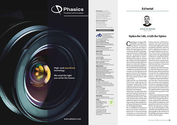Copenhagen, 15 August 1932. Niels Bohr, one of the founding figures of quantum physics, steps onto the stage to deliver the opening lecture of a conference devoted to phototherapy. In his lecture, entitled Light and Life, he questions whether physics might help in understanding living systems. Among the audience sits Max Delbrück, who would eventually shift from physics to molecular biology, a choice that ultimately led him to the 1969 Nobel Prize in Physiology or Medicine awarded for his discoveries on viral replication and genetic structure. His trajectory illustrates how physics and the life sciences have much to offer one another. Light and life are intrinsically intertwined. Light ignites the emergence and growth of living organisms, and it provides an exceptional probe for investigating their inner mechanisms. In this issue, we explore the most advanced optical methods for imaging and addressing the living world and life sciences. This issue features three articles that address all-optical neurophysiology, real-time tissue diagnostics, and smart illumination schemes for 3D biological imaging. We are delighted to inaugurate here a new section, Perspectives, dedicated to forward-looking viewpoints on what photonics can bring. The inaugural article,