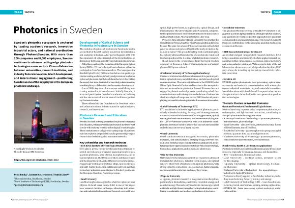 Sweden’ s photonics ecosystem is anchored by leading academic research, innovative industrial actors, and national coordination through PhotonicSweden. With more than 200 companies and 8,000 employees, Sweden continues to advance cutting-edge photonics technologies across sectors. Close collaboration between universities, research institutes, and industry fosters innovation, talent development, and international engagement— positioning Sweden as one of the key players in the European photonics landscape.