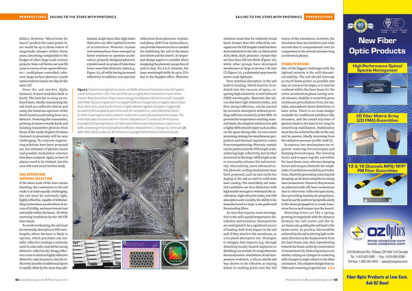Sailing to the stars with photonics PERSPECTIVES solutions must thus be relatively broad band. Greater than 50 % reflectivity averaged over the full Doppler band has been demonstrated in the lab on fabricated Al 2 O 3-MoS 2-Al 2 O 3 photonic crystals that are less than 200-nm-thick( Figure 1b), while other groups have developed membranes as large as 60 mm × 60 mm [ 7 ]( Figure 1c), a substantial step towards metre-scale lightsails.