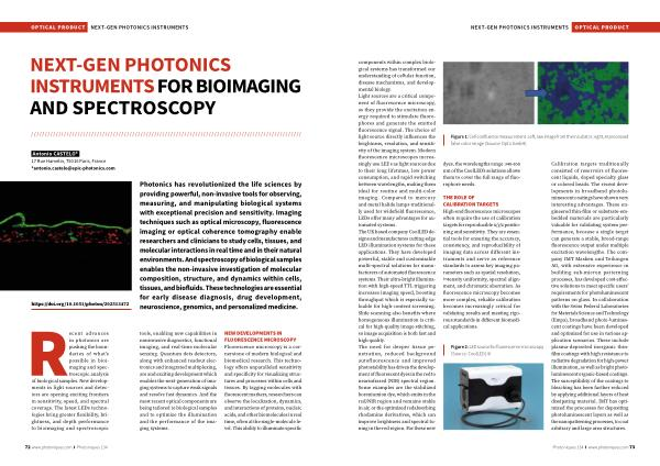 Next-Gen Photonics Instruments OPTICAL PRODUCT components within complex biological systems has transformed our understanding of cellular function, disease mechanisms, and developmental biology. Light sources are a critical component of fluorescence microscopy, as they provide the excitation energy required to stimulate fluorophores and generate the emitted fluorescence signal. The choice of light source directly influences the brightness, resolution, and sensitivity of the imaging system. Modern fluorescence microscopes increasingly use LEDs as light sources due to their long lifetimes, low power consumption, and rapid switching between wavelengths, making them ideal for routine and multi-color imaging. Compared to mercury and metal halide lamps traditionally used for widefield fluorescence, LEDs offer many advantages for automated systems. The UK based company CoolLED designs and manufactures cutting-edge LED illumination systems for these applications. They have developed powerful, stable and customisable multi-spectral solutions for manufacturers of automated fluorescence systems. Their ultra-bright illumination with high-speed TTL triggering increases imaging speed, boosting throughput which is especially valuable for high-content screening. Slide scanning also benefits where homogeneous illumination is critical for high-quality image stitching, so image acquisition is both fast and high quality. The need for deeper tissue penetration, reduced background autofluorescence and improved photostability has driven the development of fluorescent dyes in the red to nearinfrared( NIR) spectral region. Some examples are the stabilized boreniumion dye, which emits in the red / NIR region and remains stable in air, or the optimized redabsorbing rhodamine derivatives, which can improve brightness and spectral tuning in the red region. For these new