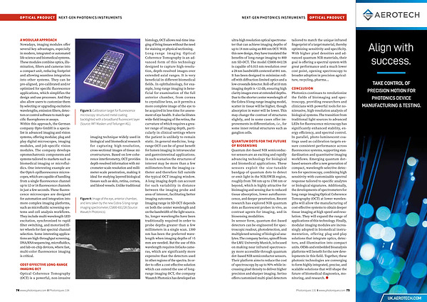 Figure 4: Image of the eye, anterior chamber, and lens taken by the new Cobra-S long-range imaging spectrometer, CS800-831 / 28( Source: Wasatch Photonics). histology, OCT allows real-time imaging of living tissues without the need for staining or physical sectioning. Long-range imaging Optical Coherence Tomography is an advanced form of this technology designed to capture high-resolution, depth-resolved images over extended axial ranges. It is very beneficial in different biomedical fields. In ophthalmology, for example, long-range imaging is beneficial for examination of the full anterior chamber, from cornea to crystalline lens, as it permits a more complete image of the eye to be acquired in less time for assessment of eye health. It also facilitates wide-field imaging of the retina, the curvature of which requires a greater range of imaging depth, particularly in clinical settings where the patient is unlikely to remain static. In general medicine, longrange OCT can be of great benefit for lumen imaging in intravascular and gastrointestinal applications. In such scenarios the structures of interest may be more than a few millimeters from the imaging catheter and therefore fall outside the typical OCT imaging window. A long imaging depth can account for such variability in distance between the imaging probe and area of interest, facilitating better imaging outcomes. Imaging range in SD-OCT depends on both the center wavelength and on the bandwidth of the light source. So, longer wavelengths have been traditionally required in order to probe depths greater than a few millimeters in a single scan. 1300 nm has been the preferred wavelength when imaging depths of > 5 mm are needed. But the use of this wavelength requires InGaAs cameras, which are significantly more expensive than the detectors used in other regions of the spectra. In order to offer a cost-effective solution which can extend the use of longrange imaging OCT, the company Wasatch Photonics has developed an