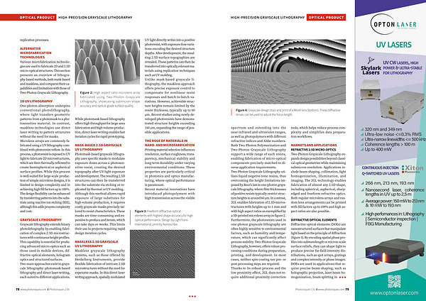 spectrum and extending into the near-infrared and ultraviolet ranges, as well as photopolymers with different refractive indices and Abbe numbers. Both Two-Photon Polymerization and Two-Photon Grayscale Lithography support a wide range of such resins, enabling fabrication of micro-optical components precisely matched to diverse application requirements. Two-Photon Grayscale Lithography utilizes liquid negative-tone resins, thus overcoming the height limitations imposed by Beer’ s law in one-photon grayscale lithography, where film thicknesses of positive resists typically restrict structure heights to around 60 µ m. In contrast, 2GL enables fabrication of 2.5D microstructures with heights up to 1 mm and with high aspect ratios as exemplified by a 3D-printed microlens array in figure 2. Furthermore, the photoresists used in one-photon grayscale lithography are often highly sensitive to environmental factors, such as humidity and temperature, which can significantly affect process stability. Two-Photon Grayscale Lithography, however, offers robust processing conditions during preparation, printing, and development. In most cases, neither spin-coating nor pre- or post-processing steps are required. Thanks to its robust process and the low proximity effect, 2GL does not require additional proximity correction