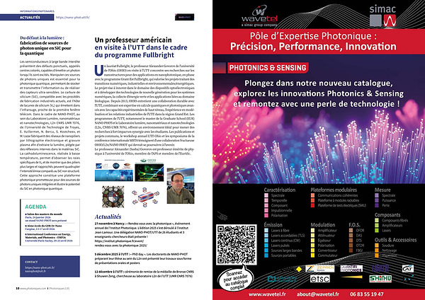 Les semiconducteurs à large bande interdite présentent des défauts ponctuels, appelés centres colorés, capables d’ émettre un photon lorsqu’ ils sont excités. Manipuler ces sources de photons uniques est essentiel pour la photonique quantique, permettant de stocker et transmettre l’ information ou de réaliser des capteurs ultra-sensibles. Le carbure de silicium( SiC), compatible avec les procédés de fabrication industriels actuels, est l’ hôte de lacunes de silicium( V Si) qui émettent dans l’ infrarouge, proche de la première fenêtre télécom. Dans le cadre de NANO-PHOT, au sein du Laboratoire Lumière, nanomatériaux et nanotechnologies, L2n CNRS UMR 7076, de l ' Université de Technologie de Troyes, E. Vuillermet, N. Bercu, S. Kostcheev, et M. Lazar fabriquent des réseaux de nanopiliers par lithographie électronique et gravure plasma afin d’ extraire la lumière, piégée par des réflexions internes dans le matériau SiC. La cathodoluminescence, réalisée à basse température, permet d’ observer les raies spécifiques de V Si et de montrer que des piliers plus larges et rapprochés peuvent quadrupler l’ intensité émise comparés au SiC non structuré. Cette approche constitue une plateforme photonique prometteuse pour des sources de photons uniques intégrées et illustre le potentiel du SiC en photonique quantique.