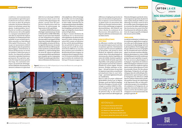 CONCLUSION Au-delà de la télémétrie, le LiDAR trouve de nombreuses applications en agriculture telles que le phénotypage( suivi de la croissance), le physiotypage( suivi de la photosynthèse), l’ envirotypage( suivi des gaz à effet de serre) et la cartographie fine de la biodiversité( suivi entomologique). Les récentes avancées et développements photoniques( e. g. micro-LiDAR et LiDAR Raman) ouvrent de nombreuses perspectives pour spatialiser et quantifier des processus physiologiques et écologiques. Cependant, de nombreux défis technologiques subsistent à ce jour comme la détection rapide de signaux dans le moyen infrarouge pour le suivi du protoxyde d’ azote lors des phases d’ épandages, l’ intégration de suivi physiologique dans des méthodologies d’ expérimentation agronomiques ad-hoc et l’ intégration de références LiDAR dans les systèmes d’ observation passifs. L’ écosystème français de la photonique et de l’ agronomie offre un cadre particulièrement propice à la consolidation, à la validation et à l’ intégration de ces approches innovantes dans des instruments au service des transitions agroécologiques et environnementales des pratiques agricoles.
