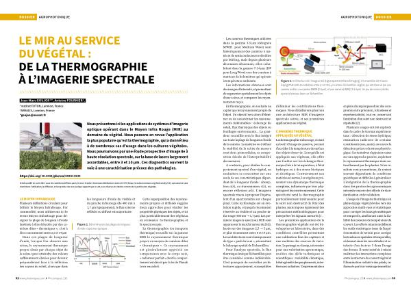 Nous présentons ici les applications de systèmes d’ imagerie optique opérant dans le Moyen Infra Rouge( MIR) au domaine du végétal. Nous passons en revue l’ application la plus populaire qu’ est la thermographie, qui a donné lieu à de nombreux cas d’ usage dans les cultures végétales. Nous poursuivons par une étude prospective d’ imagerie à haute résolution spectrale, sur la base de lasers largement accordables, entre 3 et 10 µ m. Ces diagnostics ouvrent la voie à une caractérisation précoce des pathologies.