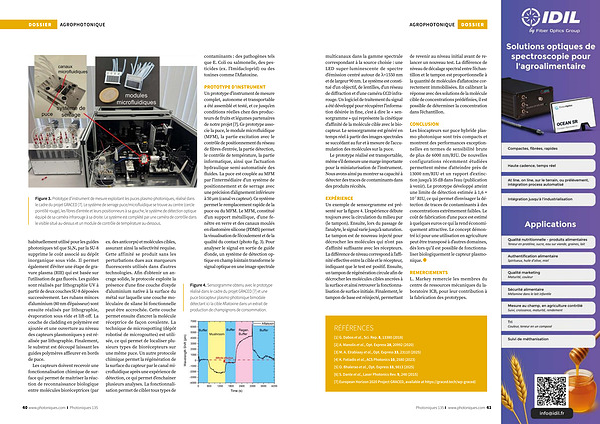 PROTOTYPE D’ INSTRUMENT Un prototype d’ instrument de mesure complet, autonome et transportable a été assemblé et testé, et ce jusqu’ en conditions réelles chez des producteurs de fruits et légumes partenaires de notre projet [ 7 ]. Ce prototype associe la puce, le module microfluidique( MFM), la partie excitation avec le contrôle de positionnement du réseau de fibres d’ entrée, la partie détection, le contrôle de température, la partie informatique, ainsi que l’ actuation hydraulique semi-automatisée des fluides. La puce est couplée au MFM par l’ intermédiaire d’ un système de positionnement et de serrage avec une précision d’ alignement inférieure à 50 µ m( canal vs capteur). Ce système permet le remplacement rapide de la puce ou du MFM. Le MFM, constitué d’ un support métallique, d’ une fenêtre en verre et des canaux moulés en élastomère silicone( PDMS) permet la visualisation de l’ écoulement et de la qualité du contact( photo fig. 3). Pour analyser le signal en sortie de guide d’ onde, un système de détection optique en champ lointain transforme le signal optique en une image spectrale