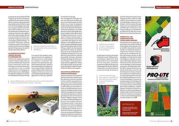 PERSPECTIVE: UNE CONVERGENCE VERS L ' INTELLIGENCE AGRICOLE La trajectoire est sans équivoque: la photonique est la colonne vertébrale technologique d ' une agriculture qui se doit d ' être plus productive et plus durable. Les analyses de marché anticipent une croissance soutenue, portée par la convergence de capteurs photoniques de plus en plus abordables avec l ' internet des objets et l ' intelligence artificielle. Les avancées en photonique intégrée sur puce( PICs) promettent de miniaturiser encore davantage ces outils, amenant la puissance d ' un laboratoire d ' analyse NIR ou Raman directement au champ. Si des freins comme le coût d ' investissement initial ou le besoin de compétences nouvelles existent, ils sont progressivement levés par des initiatives publiques et une maturité technologique croissante. La prochaine étape verra l ' émergence de systèmes de détection des maladies encore plus précoces et de solutions photoniques adaptatives, capables d ' ajuster en temps réel la lumière ou l ' analyse aux besoins spécifiques de chaque variété. C ' est bien la maîtrise du spectre lumineux qui s ' impose comme le levier fondamental d ' une nouvelle révolution verte.