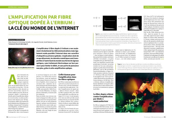 Après l’ invention du laser dans les années 1960, les télécommunications optiques naquirent dans les années 70 grâce aux premières fibres de verre de la société Corning Glass: 99 % du signal lumineux était absorbé au bout de 1 km de fibre, mais le 1 % restant suffisait pour être électroniquement « répété »; à la fin des années 80, grâce à la purification ultime du verre de silice, la même performance était obtenue pour 100 km: les premiers câbles sous-marins FO furent déployés dans l’ Atlantique et le Pacifique, transportant l’ information à 622 Megabit / s, un débit limité par l’ électronique des répéteurs. Autour de l’ an 2000, la demande de l’ échange des « data » entre banques et services l’ emporta sur la téléphonie, et il fallait bien trouver une solution; mais les répéteurs électroniques étaient encore limités au Gigabit / s. Alors resurgit une ancienne idée: régénérer les signaux lumineux directement dans le cœur de la fibre, en jouant sur l’ effet LASER, autrement dit: l’ effet d’ émission stimulée d’ Einstein, où chaque photon se dédouble, et ainsi de suite par avalanche. Dans cet article, nous verrons comment le dopage de la fibre par l’ ion erbium( une terre-rare) permet d’ amplifier, non pas un mais plusieurs signaux optiques simultanément, cette découverte ayant rendu possible l’ internet, en termes de portée globale et de débits virtuellement illimités, cela sous l’ angle de mon parcours personnel.