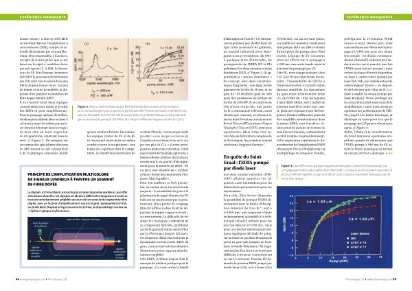 bonne raison: à Murray Hill( MH) on s’ activait déjà sur l’ amplificateur à semiconducteur( SOA), compact et activable directement par courant électrique. Mon responsable, I. Kaminow, accepta de bonne grâce que je me lance sur le sujet, à condition de ne pas m’ y égarer(!). À MH, le laboratoire de J. B. MacChesney( inventeur de la MCVD, processus de fabrication des FO) avait tout le savoir-faire des fibres dopées terres-rares: en peu de temps et sans formalités, je disposais d’ un premier échantillon de fibre dopée erbium( EDF). Il se trouvait ainsi deux équipes concurrentes pour explorer le sujet des EDFA( A pour amplificateur). Pour le pompage optique de la fibre, Southampton utilisait alors un laser à colorant pompé lui-même par un laser krypton émettant dans le rouge; de mon côté un laser argon-ion de récupération, émettant dans le vert, cf. Figure 2. On imagine les sarcasmes des spécialistes télécoms de MH devant ce qui ressemblait à de la physique amusante plutôt qu’ une solution d’ avenir. En somme, les équipes rivales de SU et de BL se trouvaient unies dans un même combat contre le scepticisme: une forme de coopétition dans la compétition. Je bénéficiais néanmoins du