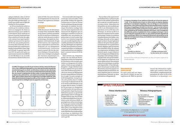 Le CD est néanmoins utilisé en routine par de nombreux laboratoires ou compagnies de chimie ou pharmaceutiques pour vérifier la conformation d ' une molécule ou mesurer la pureté énantiomérique d ' une solution et il existe des appareils commerciaux( spectropolarimètres) qui mesurent les spectres de CD avec une grande précision. Au niveau de la recherche, de nombreuses études sont conduites pour étendre les possibilités. Il peut s’ agir soit d ' élargir la gamme spectrale vers l’ UV( en particulier grâce au rayonnement synchrotron( SRCD)) ou vers l’ IR( dans ce cas, on sonde les transitions vibrationnelles et on parle de VCD). Une autre direction est d’ implémenter les mesures de CD dans des expériences résolues en temps.