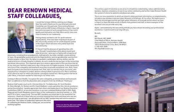 I would like to begin 2024 by wishing you a Happy New Year and to thank you for your kind welcome and friendship over this past year . Since joining Renown Health and the UNR School of Medicine in April , I have felt blessed to be a part of such a proud history of top-notch quality and innovative care that offers world-class care close to home for our community .