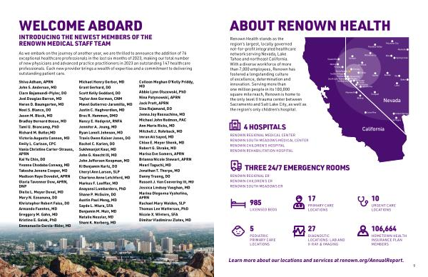 Renown Health stands as the region ’ s largest , locally governed not-for-profit integrated healthcare network serving Nevada , Lake Tahoe and northeast California . With a diverse workforce of more than 7,000 employees , Renown has fostered a longstanding culture of excellence , determination and innovation . Serving more than one million people in its 100,000 square mile reach , Renown is home to the only level II trauma center between Sacramento and Salt Lake City , as well as the region ’ s only children ’ s hospital .