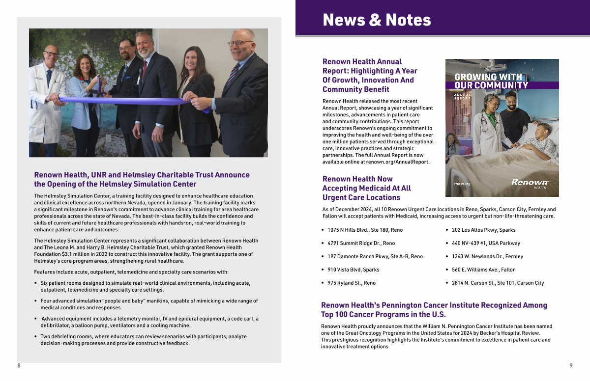 The Helmsley Simulation Center, a training facility designed to enhance healthcare education and clinical excellence across northern Nevada, opened in January. The training facility marks a significant milestone in Renown ' s commitment to advance clinical training for area healthcare professionals across the state of Nevada. The best-in-class facility builds the confidence and skills of current and future healthcare professionals with hands-on, real-world training to enhance patient care and outcomes.