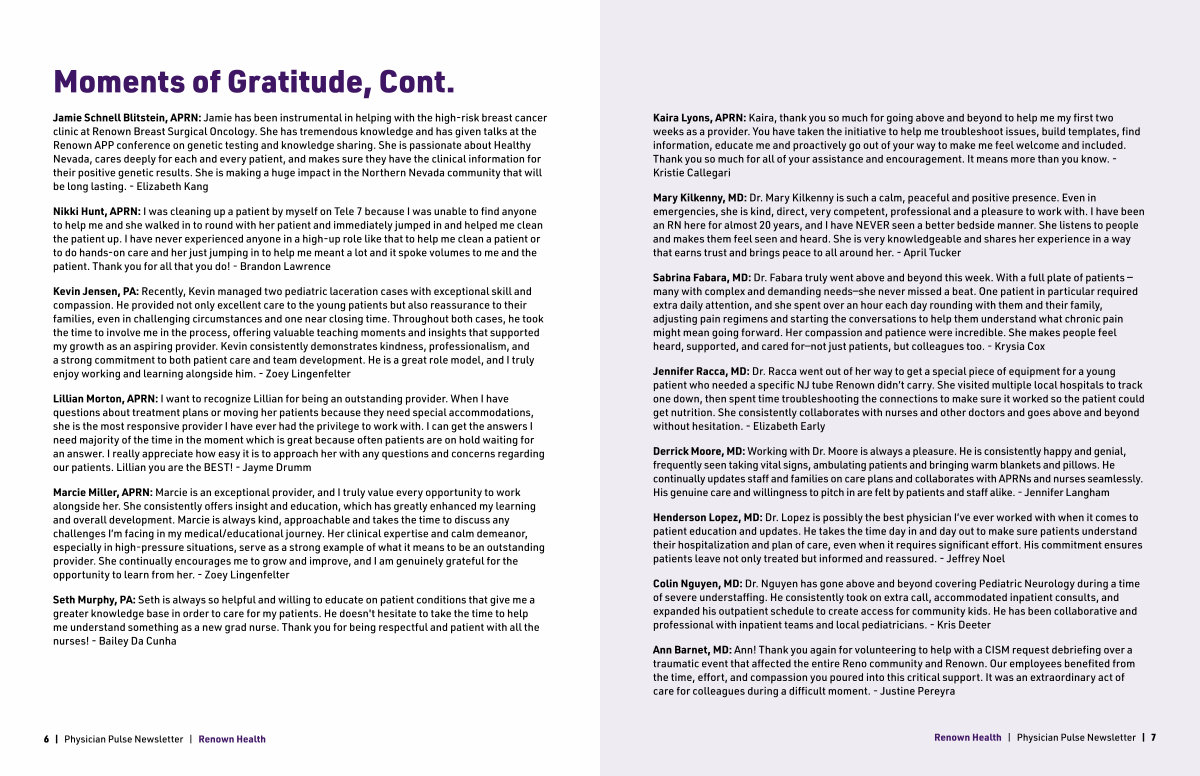 Jennifer Racca, MD: Dr. Racca went out of her way to get a special piece of equipment for a young patient who needed a specific NJ tube Renown didn’ t carry. She visited multiple local hospitals to track one down, then spent time troubleshooting the connections to make sure it worked so the patient could get nutrition. She consistently collaborates with nurses and other doctors and goes above and beyond without hesitation.- Elizabeth Early