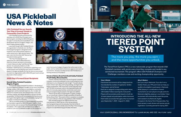 The Tiered Point System( TPS) is a new nationwide program that rewards USA Pickleball members with points every time they compete and medal in any sanctioned tournament. This program offers USA Pickleball Champion and Challenger members a new and exciting championship opportunity.