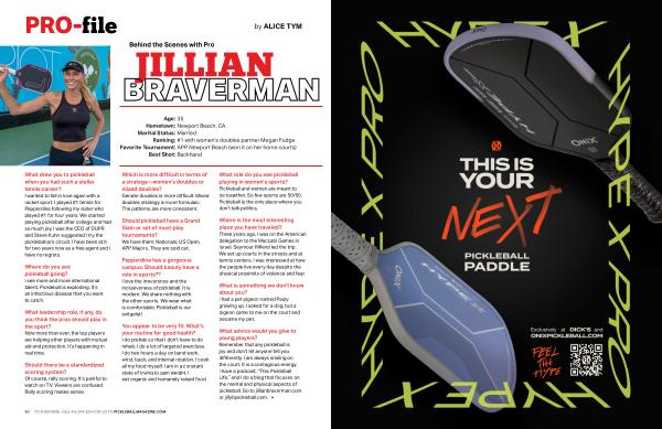 What advice would you give to young players? Remember that any pickleball is joy and don’ t let anyone tell you differently. I am always smiling on the court. It is a contagious energy. I have a podcast,“ This Pickleball Life,” and I do a blog that focuses on the mental and physical aspects of pickleball. Go to jillianbraverman. com or jillybpickleball. com. •