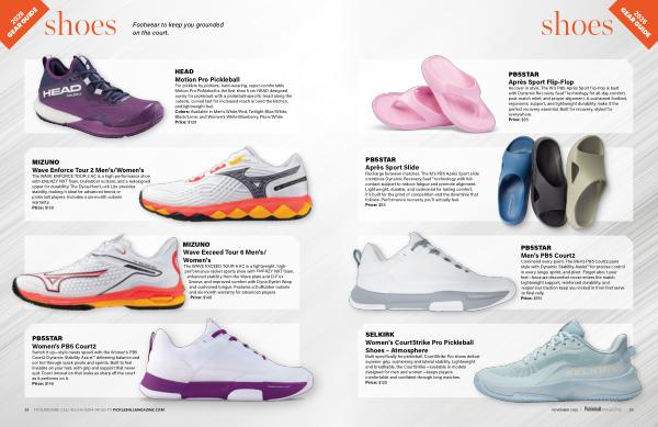 Built specifically for pickleball, CourtStrike Pro shoes deliver superior grip, cushioning and lateral stability. Lightweight and breathable, the CourtStrike— available in models designed for men and women— keeps players comfortable and confident through long matches. Price: $ 120