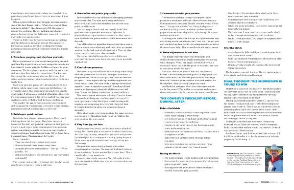 Two nervous systems trying to cooperate under pressure is a unique challenge. Silence breeds tension. Communication breaks it. Simple, positive words(“ Nice reset,”“ I’ ve got the middle,” etc.) keep both players anchored in the present. And don’ t underestimate physical connection— a high-five, a fist bump, direct eye contact and a nod.