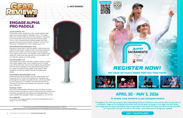 Price: $ 259.99 To purchase, visit engagepickleball. com / collections / allpaddles / products / alphapro( use code: PBMAG).