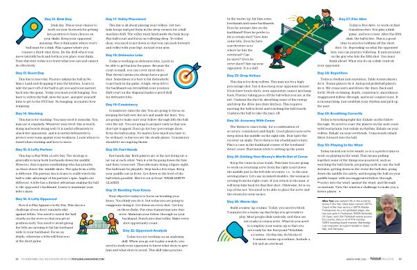 Today turned out to be windy, so it is a perfect time to work on playing in the wind. That means pulling together some of the things you practiced, such as watching the ball closely, preparing early in case the ball deviates, getting down in the event the ball dies, going down the middle for safety, and keeping the ball on your paddle longer with an exaggerated follow-through. Practice into the wind, against the wind, and through crosswinds. View the wind as a challenge to make you a better player. •
