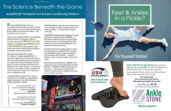 “ AnkleSTONE ® is engineered to condition the foot and ankle for real pickleball athletic demands,” says Dick Belmont, CMO of ZANEEZ ® Health.