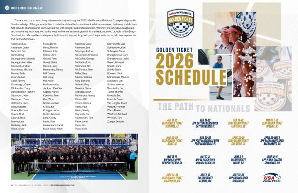 Thank you to the extraordinary referees who helped bring the 2025 USA Pickleball National Championships to life. Your knowledge of the game, attention to detail, and steadfast commitment to fairness ensured that every match, from first serve to championship point, was played with integrity and professionalism. We know the long days, tough calls, and unwavering focus required at this level, and we are sincerely grateful for the dedication you brought to San Diego. You don’ t just officiate the sport— you uphold its spirit, support its growth, and help create the world-class experience that defines Nationals.