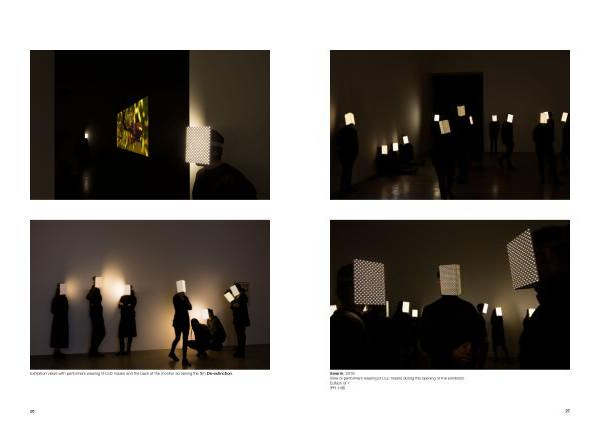Above : View of the room with a figure sitting in the dark . Below : View of Mating , 2015 ( active ). A man and a woman play a game of dice , each wearing an LED mask which obscures their face . The dice are made of amber , in each an insect is embedded . The players ’ respective masks light up in a rhythm that is not immediately discernable to onlookers , creating the impression of witnessing a conversation without being able to follow its significance . This sequence of illumination is in fact based on the mating behavior of fireflies . Edition of 3 ( PH 144 )